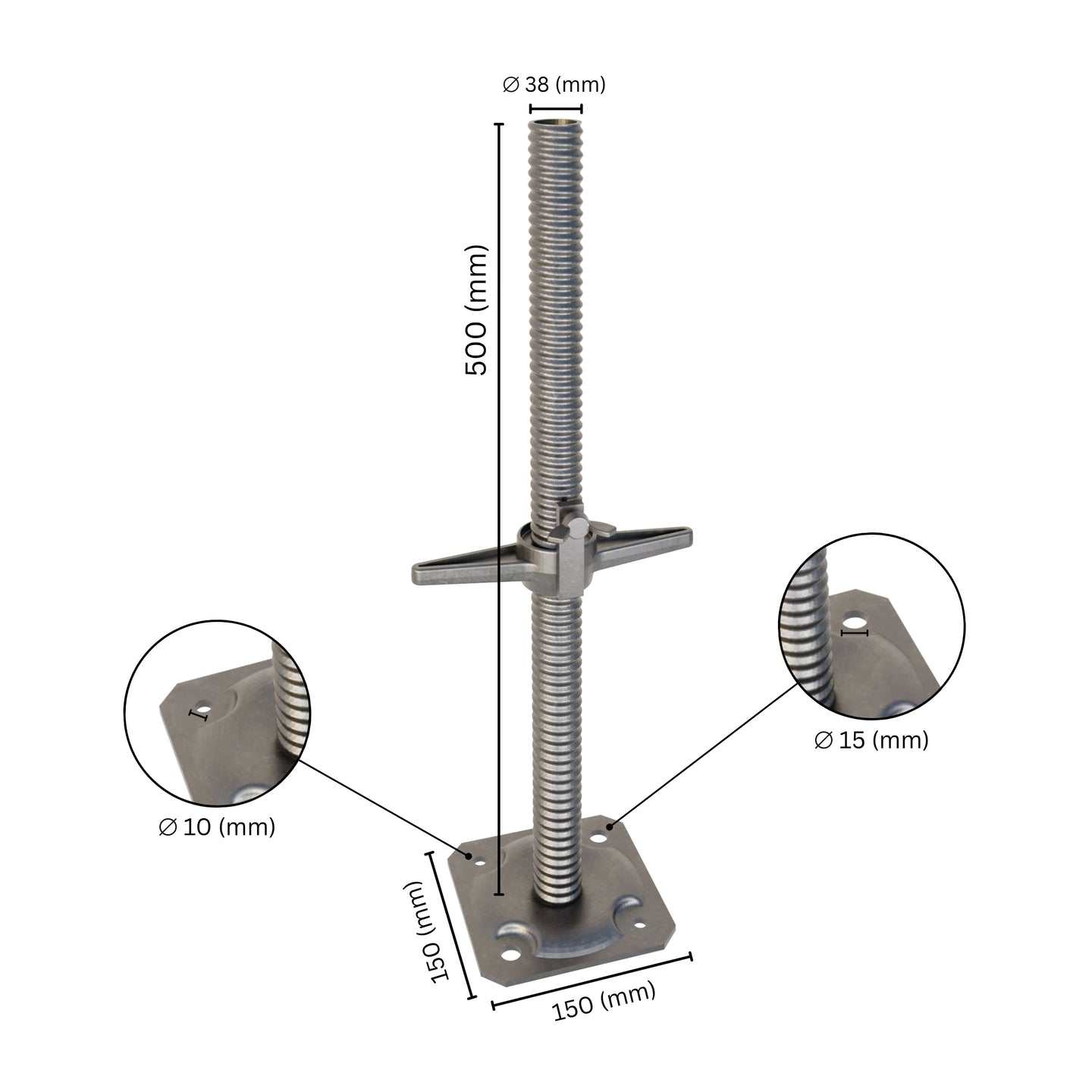 TECHNICAL DATA - Length: 500 mm (Working height - 350 mm); Diameter: 38 mm; Base plate: 150 x 150 mm; Holes in base plate: 2 holes Ø 10 mm & 2 holes Ø 15 mm; Complies with: DIN 4425; Material: Electro Zinc Plated Steel
