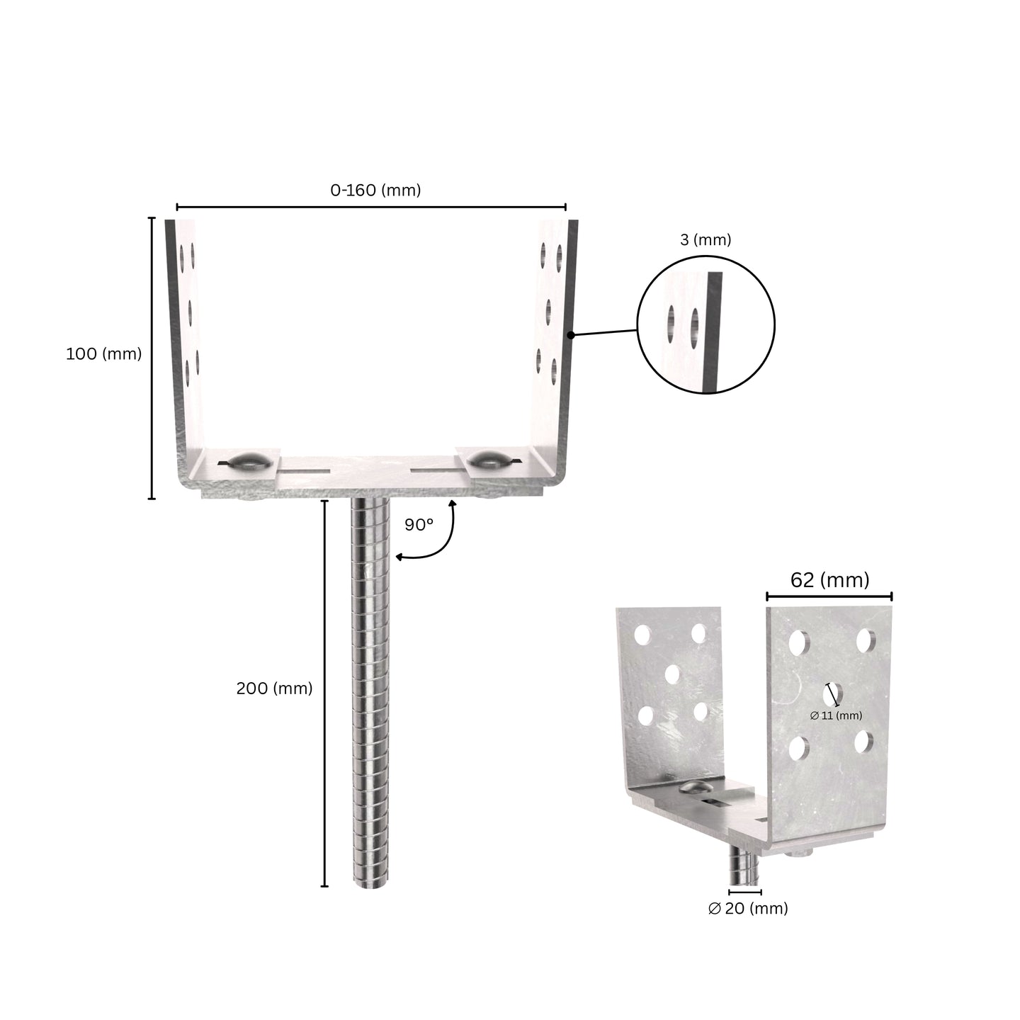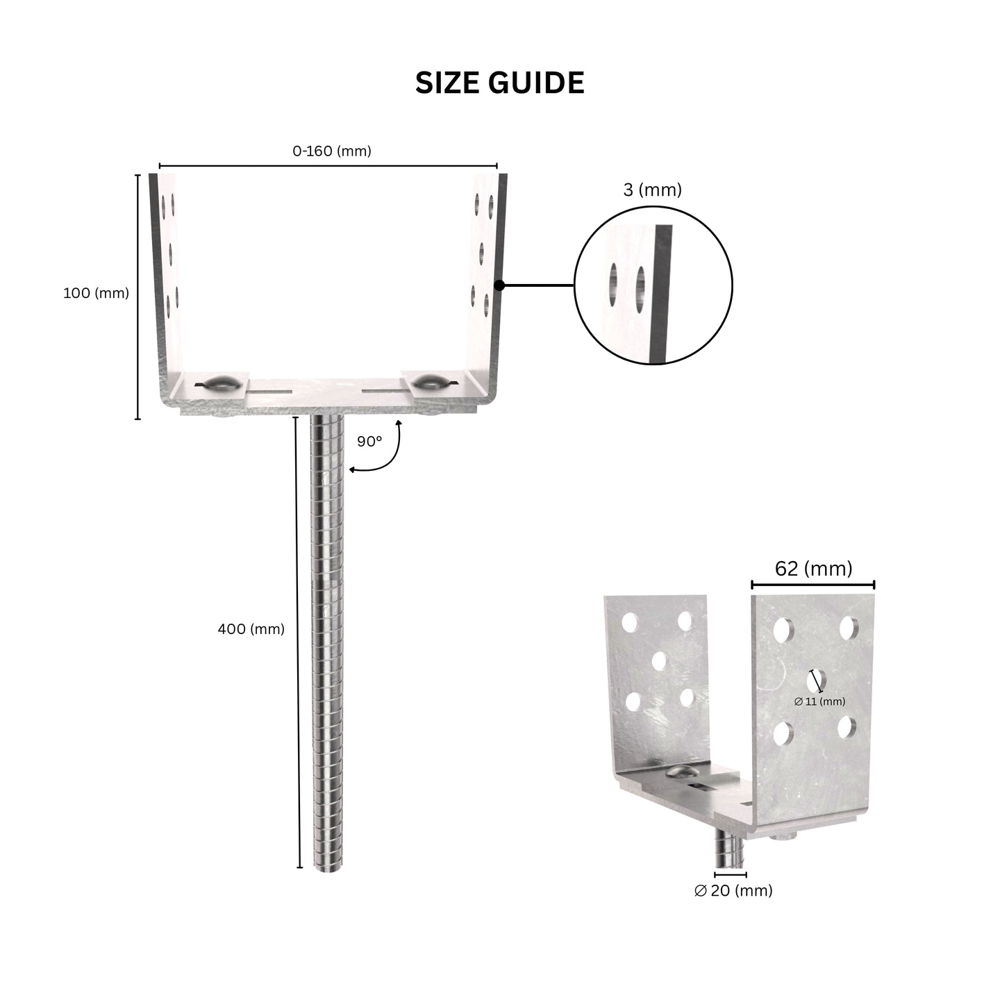 Technical Details - Width Adjustment Range: 0-160 mm - Screw-on sleeve holder: 60 x 100 x 3 - TMT Rod: 20 x 400 mm - Weight: 1.5 kg - Material: Heavy-duty Steel - Finish: Electro Zinc Plated - Colour: Silver - Pack: 1 x U Type Post Support Width Adjustable