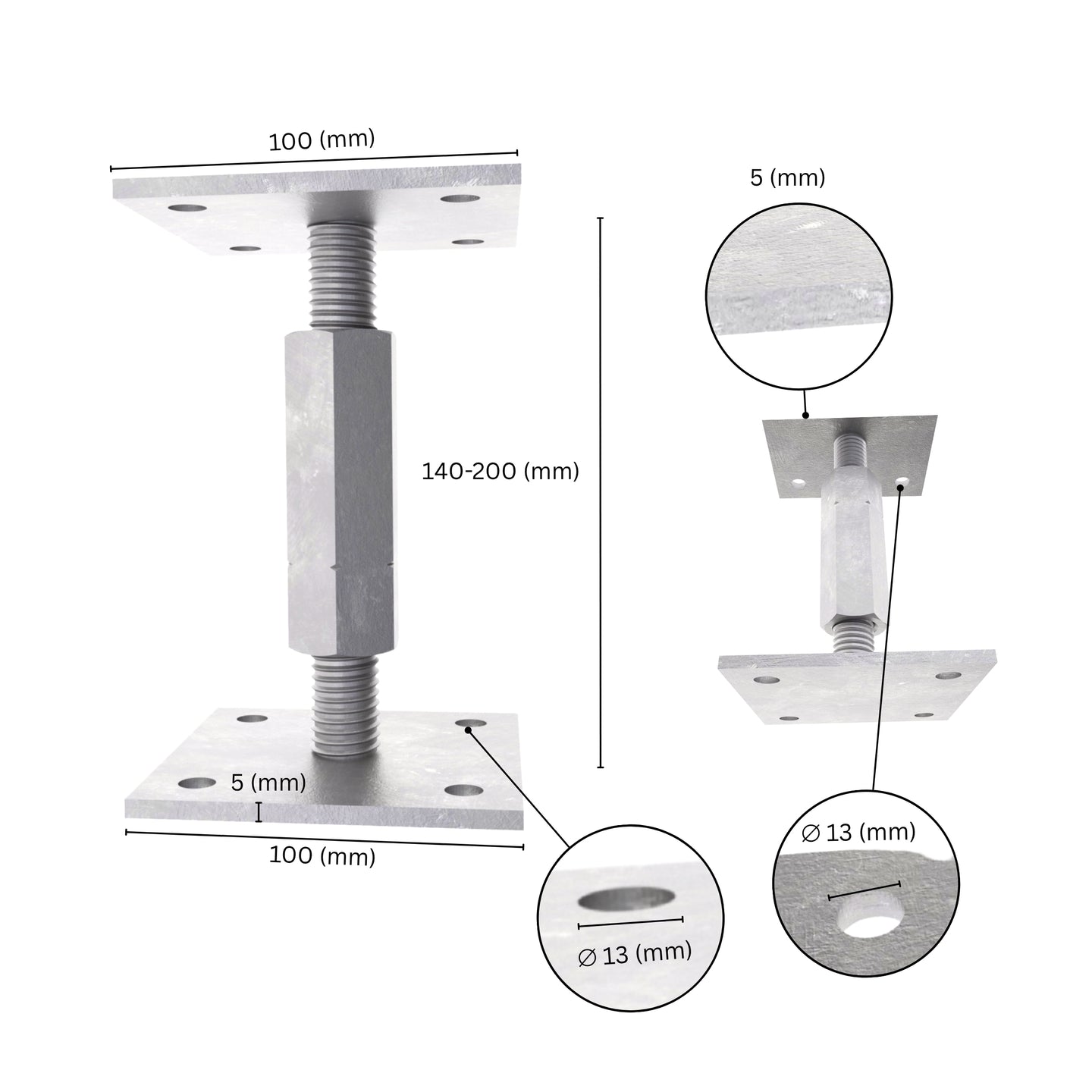 FEATURES - The post supports can be screwed onto a flat concrete or wooden floor using 4 holes per plate, each with a diameter of 13 mm. If the foundation is not the same height everywhere, Post support can be adjusted in height range.