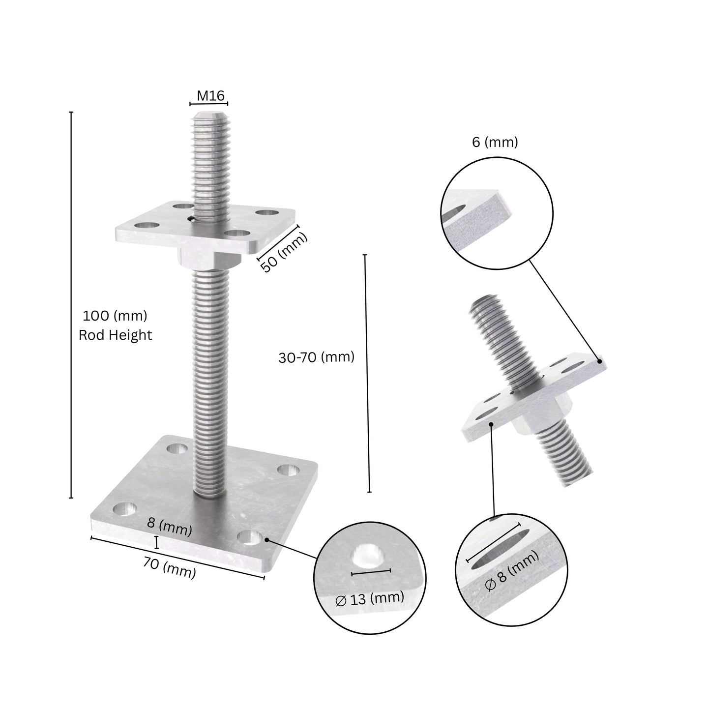 VERSATILITY - For stability, approximately 10 - 20 mm of the adjustment range must be reserved for thread security. The hot-dip galvanisation ensures that the post support is well-protected against weather conditions. The base plate measures 160 × 100 mm, while the support plate is 100 × 100 mm.