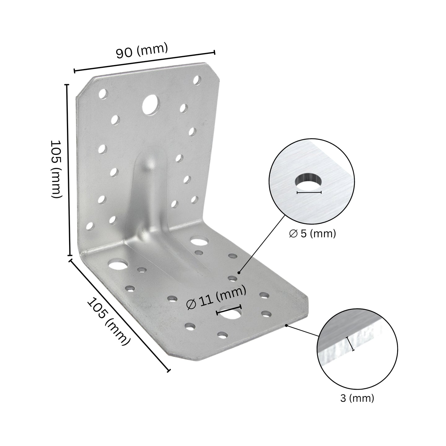 TECHNICAL DATA - Dimensions: 105 x 105 x 90 x 3 mm - Leg length: 105 mm - Leg width: 90 mm - Holes: 24 holes Ø 5 mm - Holes: 4 holes Ø 11 mm - Material thickness: 3 mm - PRODUCT type: Wood connector - Material type: Steel - Finish: Sendzimir galvanized