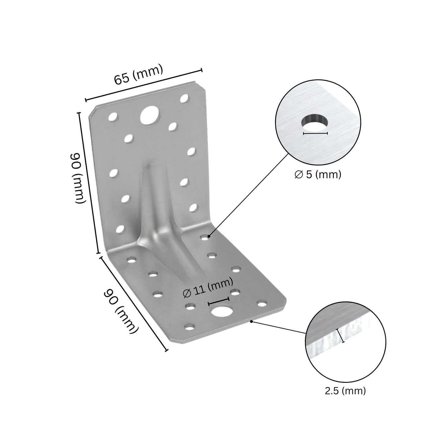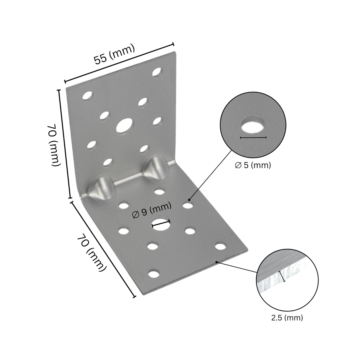 FEATURES - The pre-drilled holes with diameters of 5 mm, 9 mm, and 11 mm make installation straightforward using the appropriate fastening accessories. The number of holes varies based on the size of the Angle Corner Brackets for Wood. Please note that the number of brackets required depends on static load requirements, and these angle brackets are not meant for elevated surfaces like tree edges.