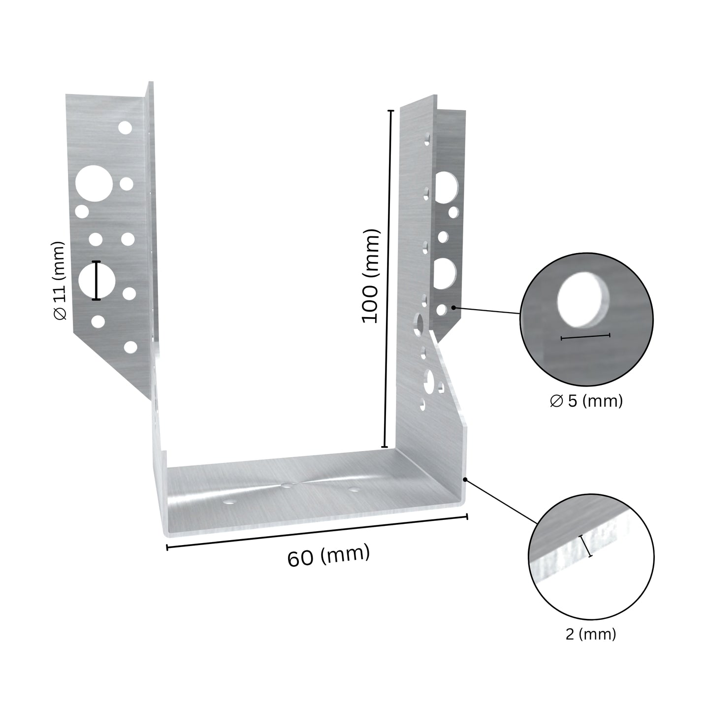VERSATILITY - The multi-truss hanger comes in sizes: 60 x 100 mm (24 holes Ø 5 mm, 4 holes Ø 9 mm), 80 x 120 mm (30 holes Ø 5 mm, 4 holes Ø 11 mm), and 100 x 140 mm (35 holes Ø 5 mm, 4 holes Ø 9 mm, 4 holes Ø 14 mm). These hangers are perfect for supporting purlin beams and various construction needs.