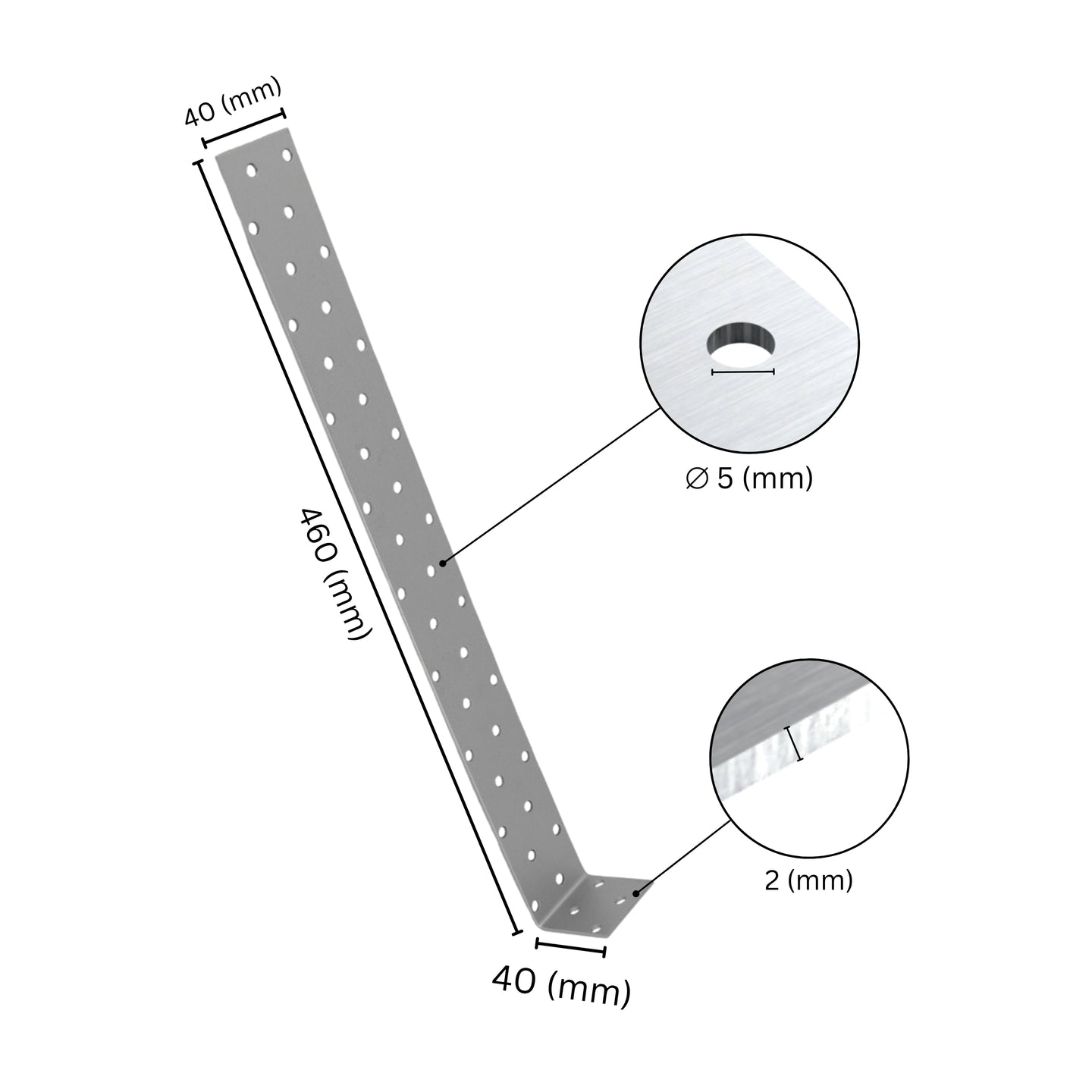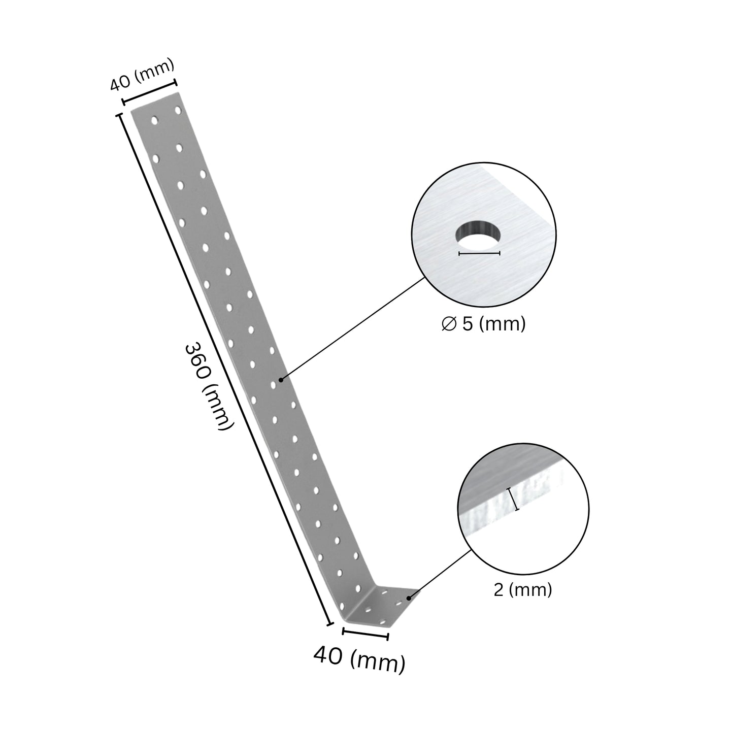 TECHNICAL DATA - Dimensions: 260 x 40 x 40 x 2 mm - Length: 260 mm - Width: 40 mm - Holes: 30 holes Ø 5 mm - Material thickness: 2 mm - Product type: Wood connector - Material type: Steel - Finish: Sendzimir galvanized