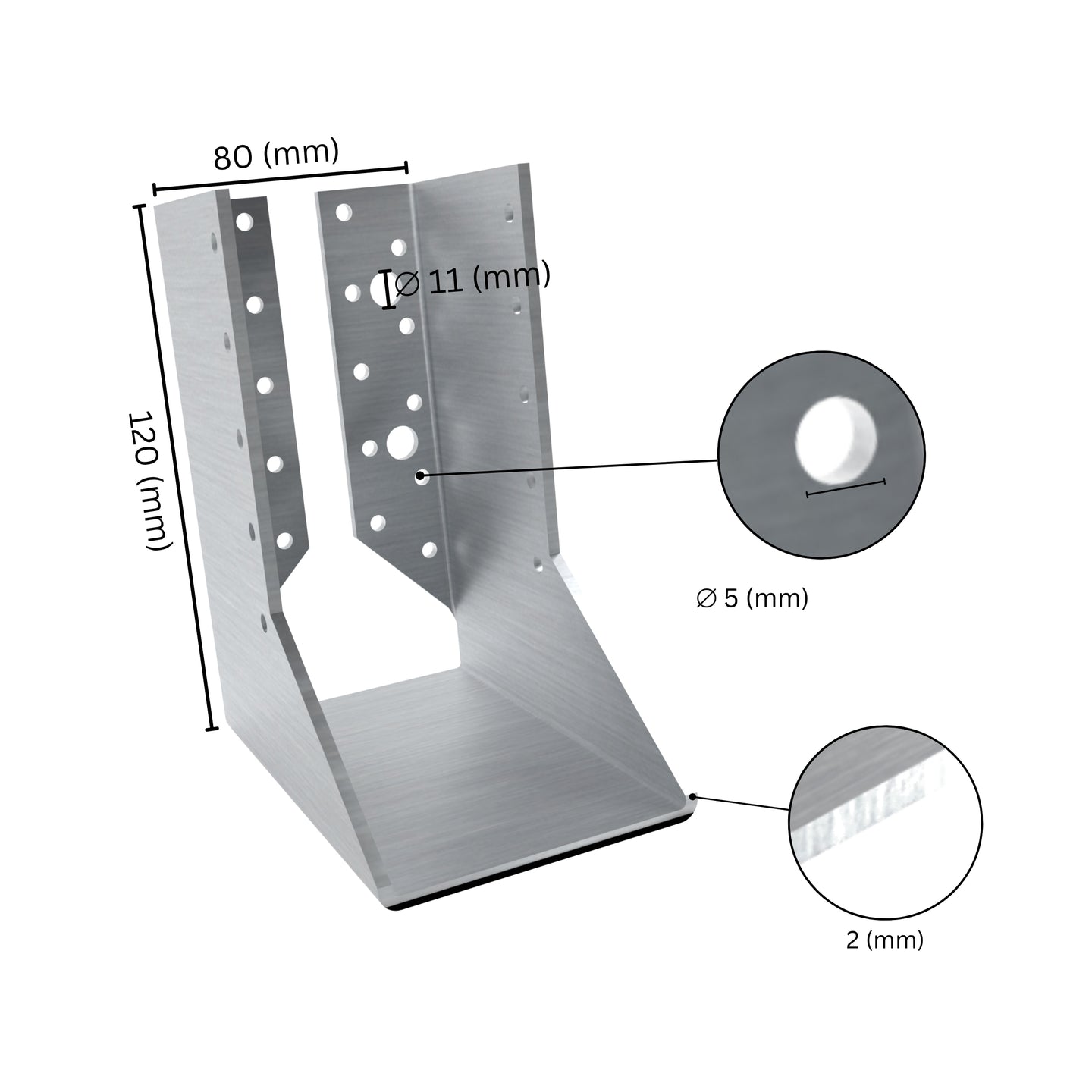 VERSATILITY - The joist hanger is available in the following sizes: 80 x 120 x 2 mm (30 holes Ø 5 mm, 4 holes Ø 11 mm), 100 x 140 x 2 mm (35 holes Ø 5 mm, 4 holes Ø 9 mm, 4 holes Ø 14 mm), making it suitable for a wide range of construction needs.