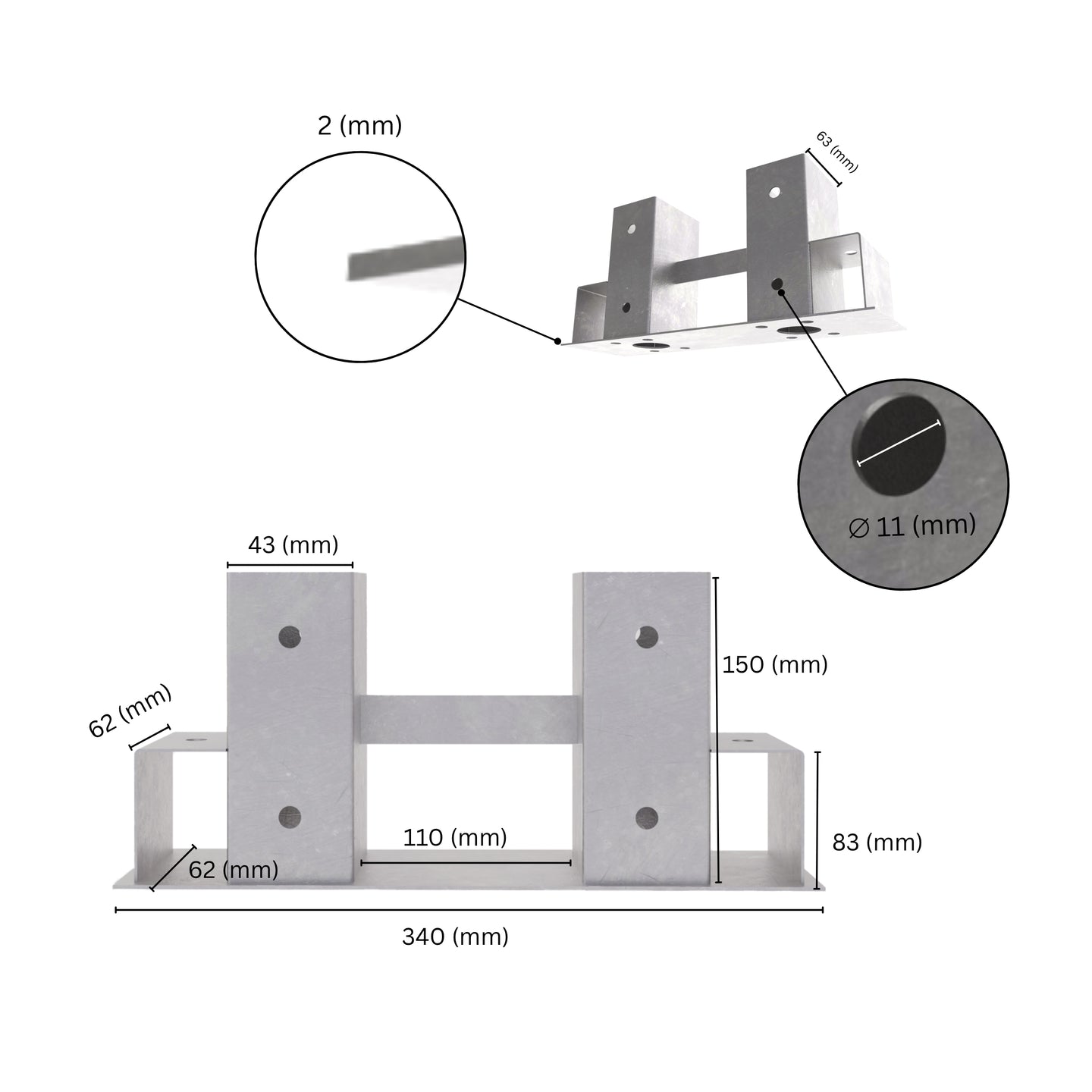 TECHNICAL DATA - Mounting the wood stacker is quick and easy. The fittings are designed for a stable and secure connection of vertical and horizontal wooden beams. Suitable dimensions of vertical beams 60 x 80 mm and horizontal beams 40 x 60 mm. The dimensions of the fittings are a x W x C mm.