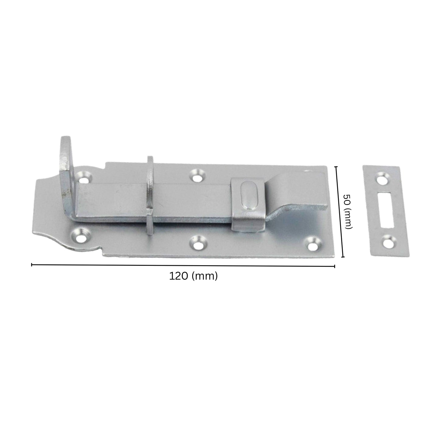 TECHNICAL DATA - Total length of the bolt: 90 mm - Stroke of the bolt: 20 mm - Width of the bolt: 16 mm - Length of base plate: 100 mm - Width of base plate: 50 mm - Holes in base plate: 6 holes Ø 4 mm - Material thickness of base plate: 2 mm - Length of strike plate: 50 mm - Width of strike plate: 19 mm - Material thickness of strike plate: 1 mm - Holes in strike plate: 2 holes Ø 5 mm - Material: steel - Finish: galvanized - Product type: bolt