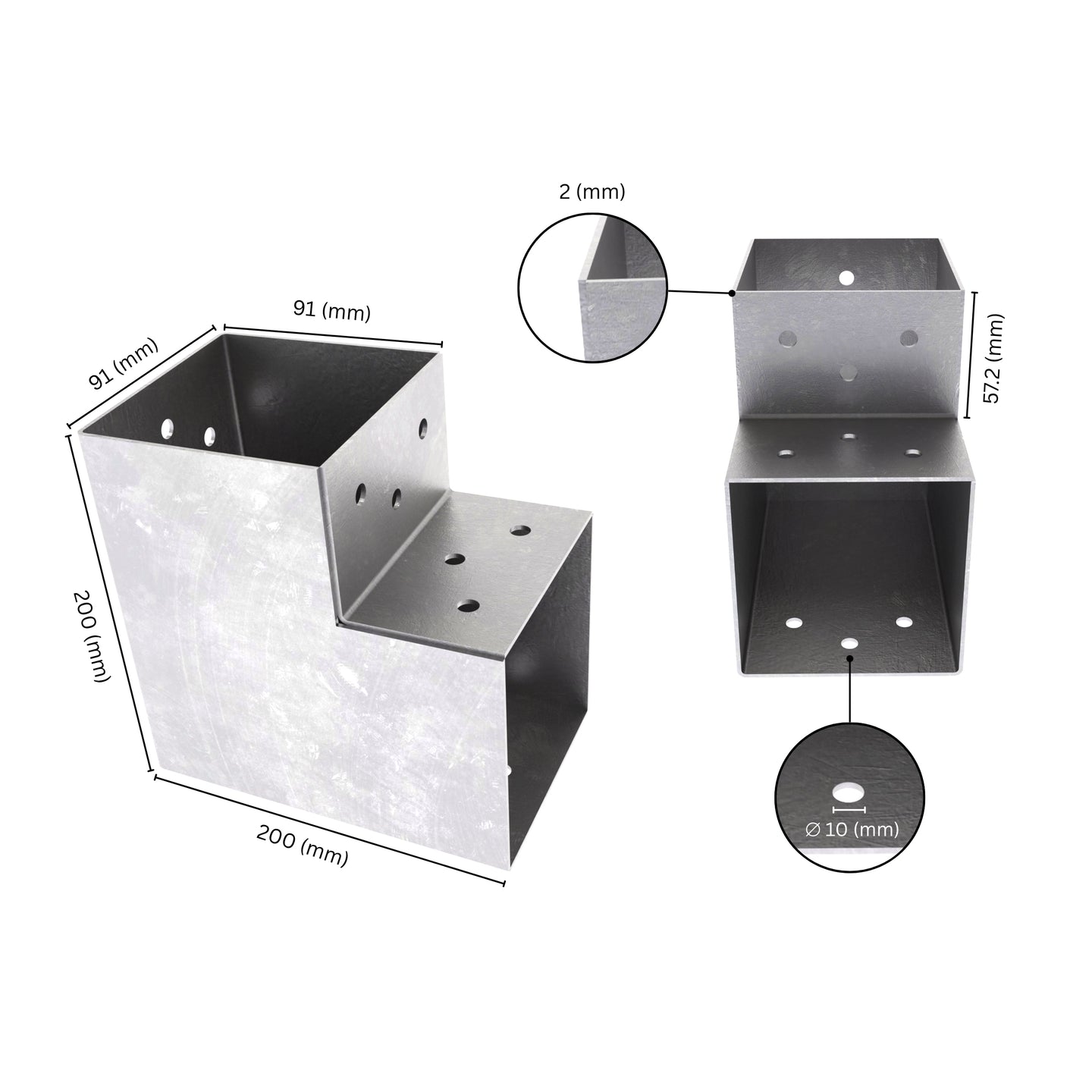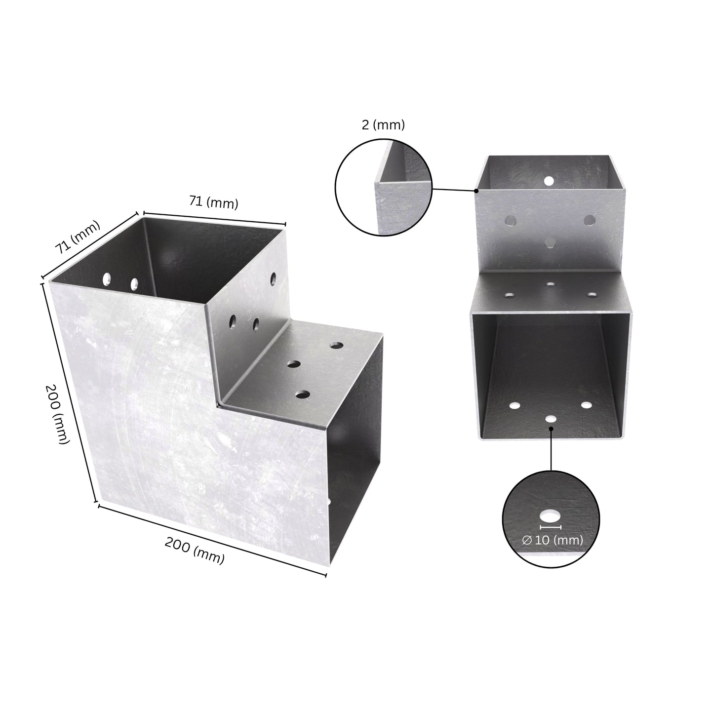 TECHNICAL DATA - Design: Corner connection for 2 wooden posts 70 x 70 mm. Dimensions: 200 x 200 x 71 mm. Material thickness: 2 mm. Number of pre-drilled holes: 8 holes with a diameter of 10 mm. Material: Fire-galvanized steel.