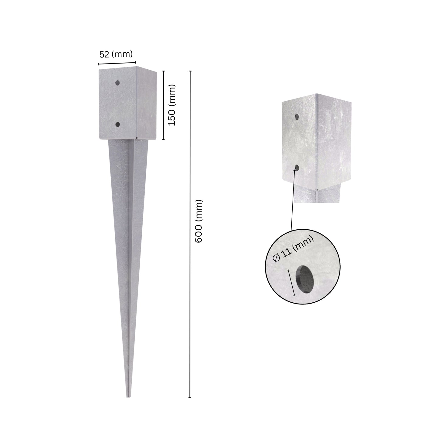 USABILITY - The Fence post spikes are available in lengths of 600 mm, 750 mm, and 900 mm, and in the following Holder sizes: 46 x 46 mm, 51 x 51 mm, 52 x 52 mm, 71 x 71 mm, 81 x 81 mm, 91 x 91 mm, 101 x 101 mm, 121 x 121 mm, and 141 x 141 mm.