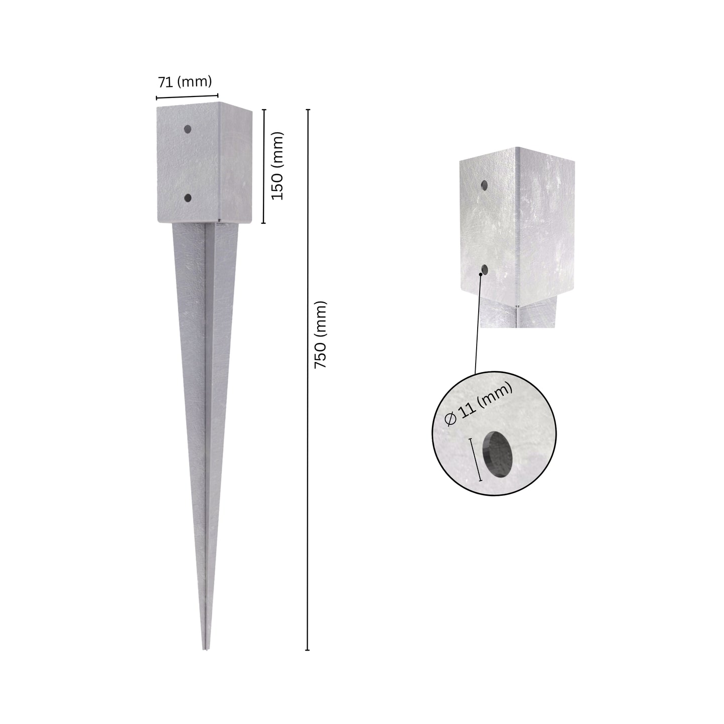 FEATURES - Once the fence post holder spike has been hammered evenly and vertically into loose soil, the post can be securely installed using two wood construction screws. The necessary holes are already provided in the side walls with a Ø of 11 mm.