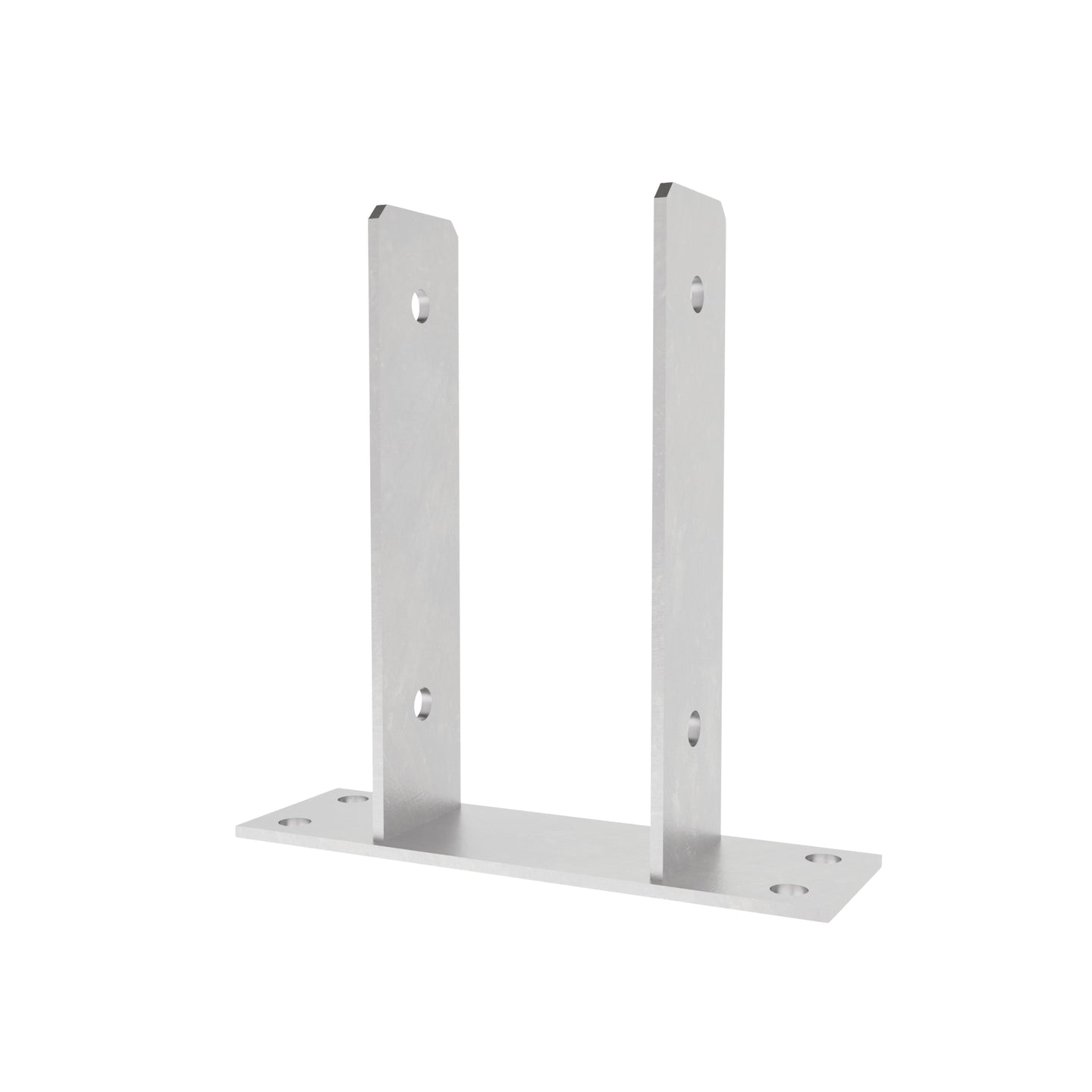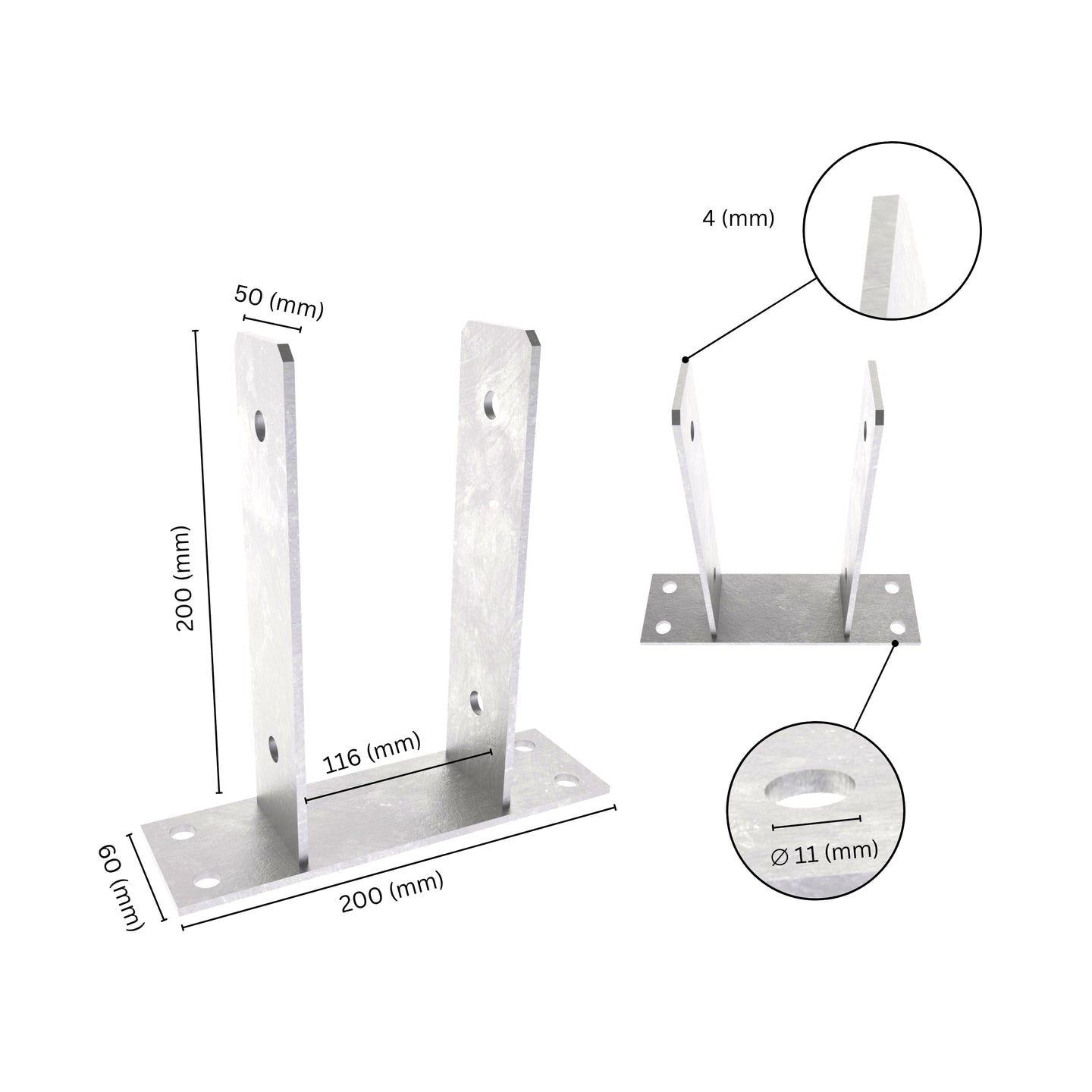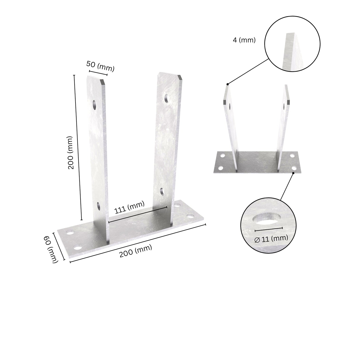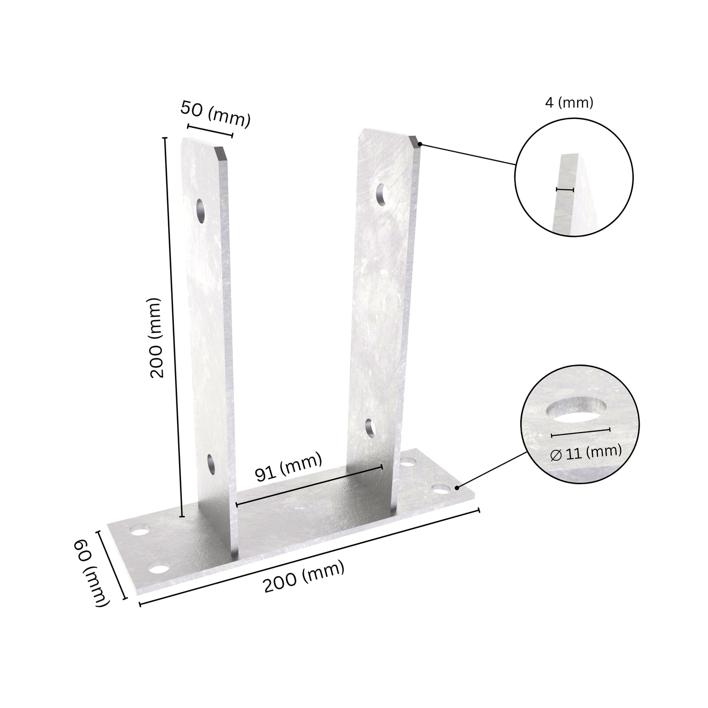 TECHNICAL DATA - Fork width / clear width: 101 mm - Fork height: 200 mm - Fork depth: 50 mm - Fork thickness: 4 mm - Holes: 8 holes Ø 11 mm - Base plate: 200 x 60 mm - Material type: hot-dip galvanised steel
