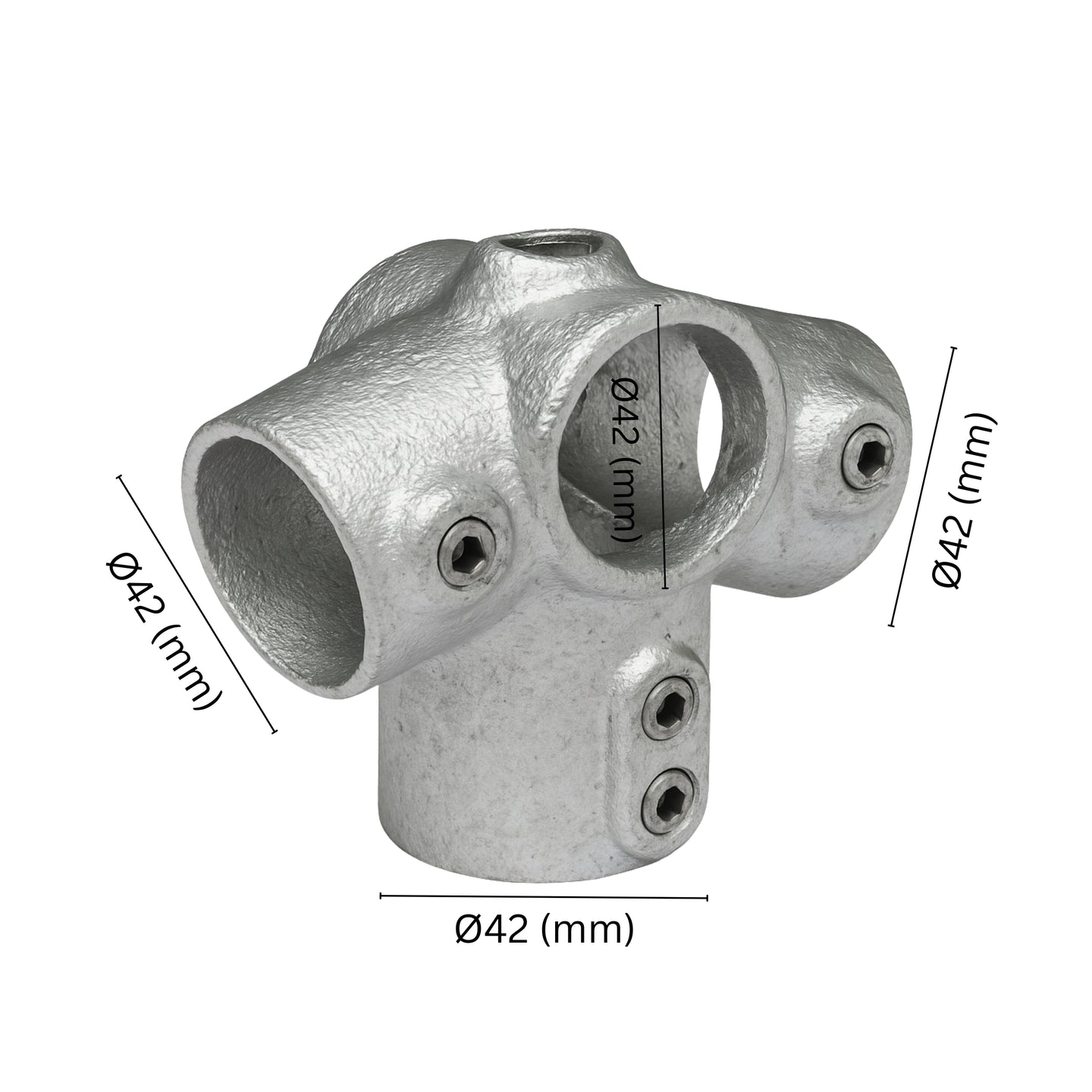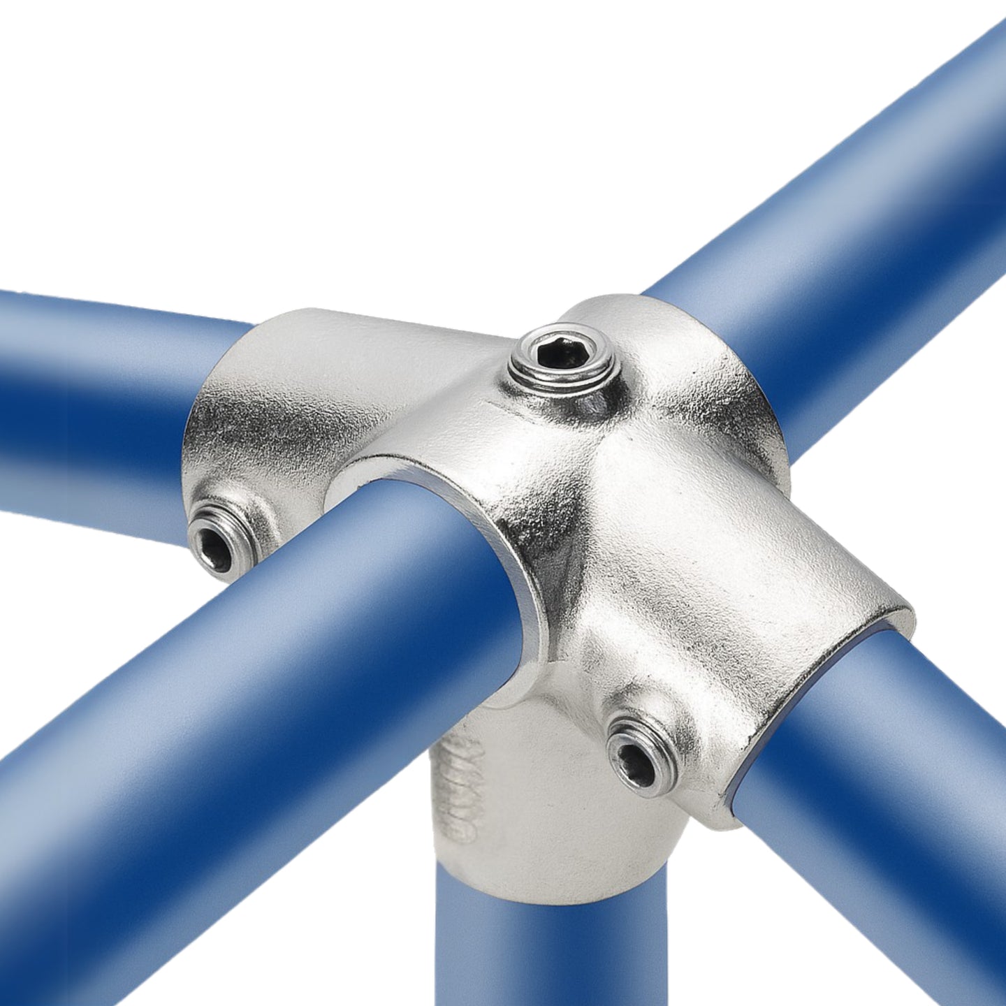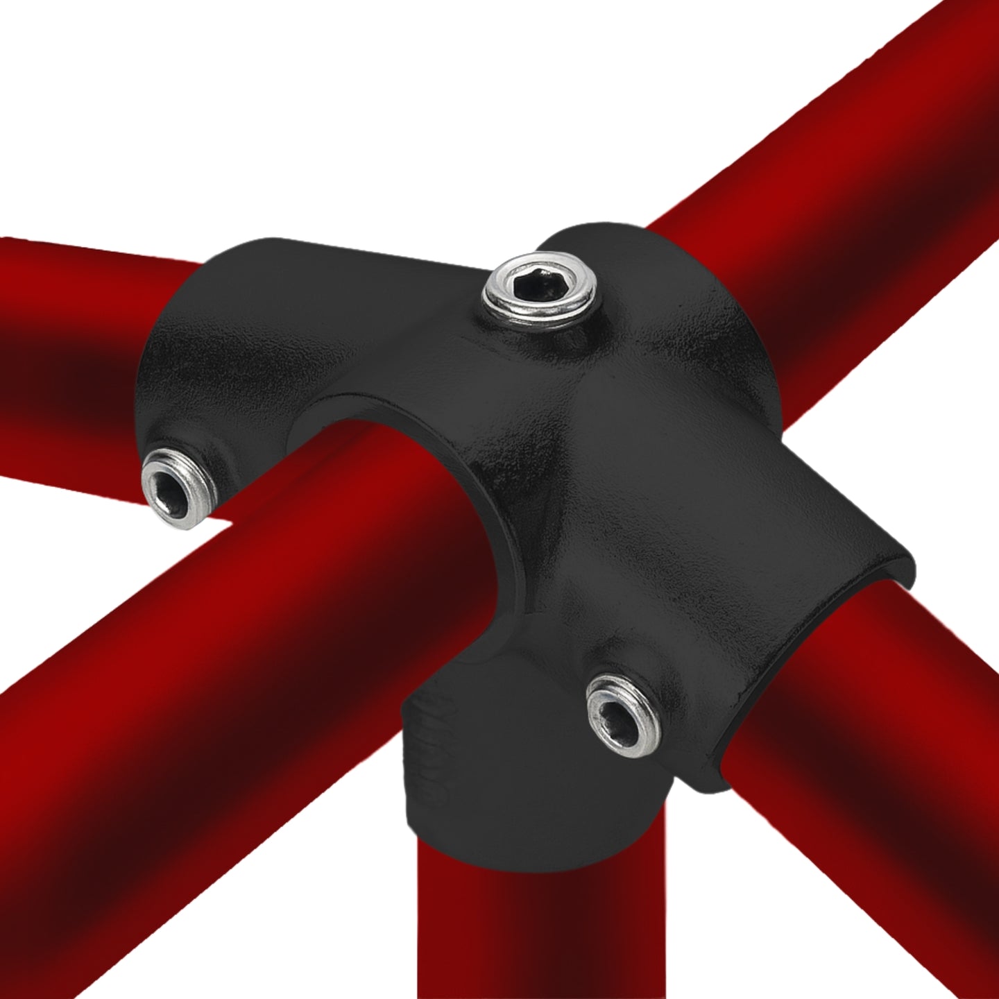 Strong 4-Way Roof Connection - Ridge fitting connects four tubes to create a stable roof framework. It forms a 120° angle at the ridge, with 60° on either side of the vertical tube. It provides a balanced connection for constructing sloped tubular roofs.