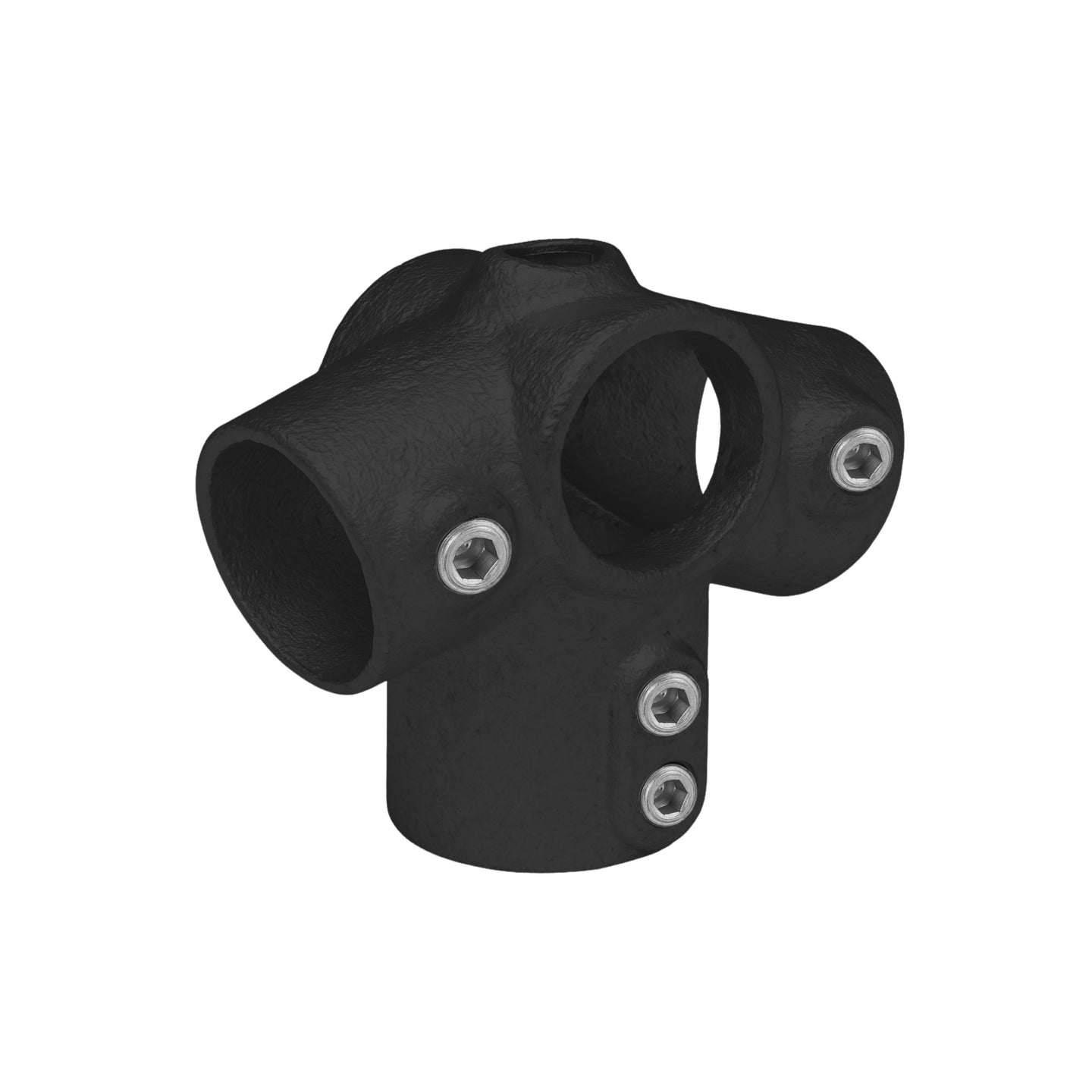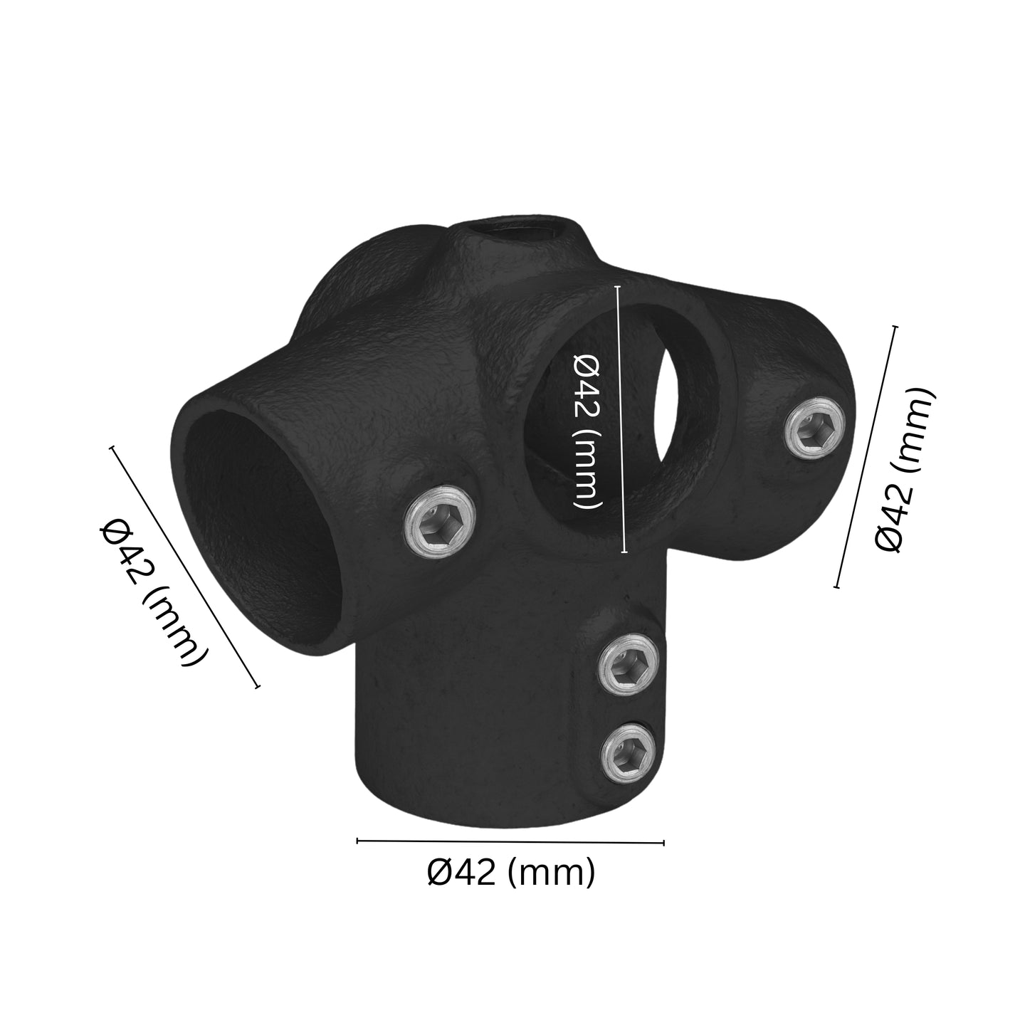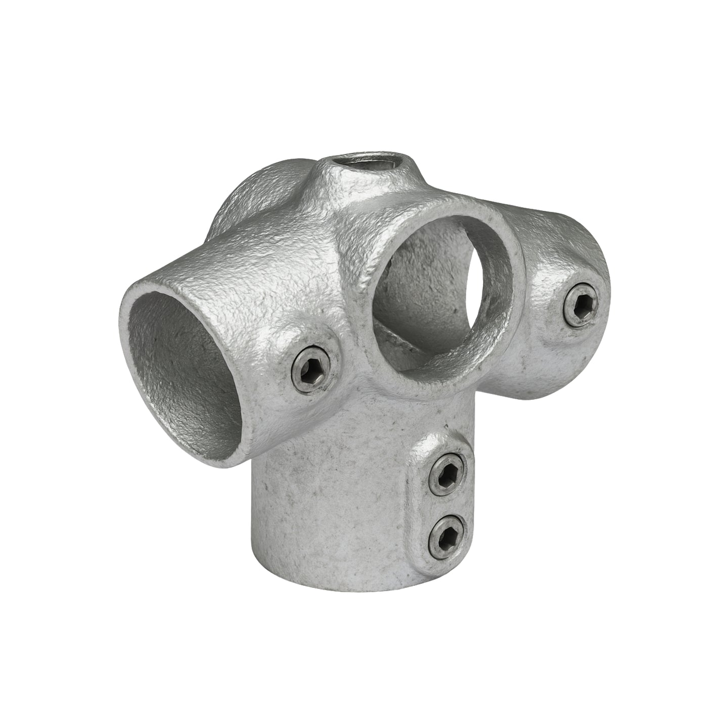 Strong 4-Way Roof Connection - Ridge fitting connects four tubes to create a stable roof framework. It forms a 120° angle at the ridge, with 60° on either side of the vertical tube. It provides a balanced connection for constructing sloped tubular roofs.