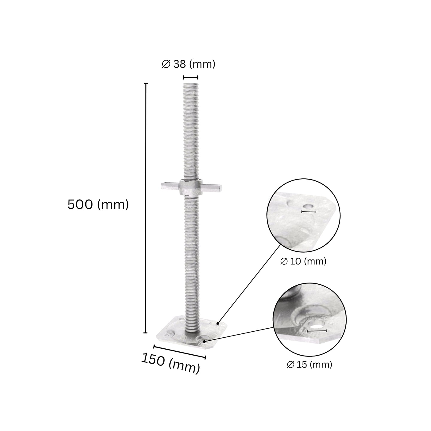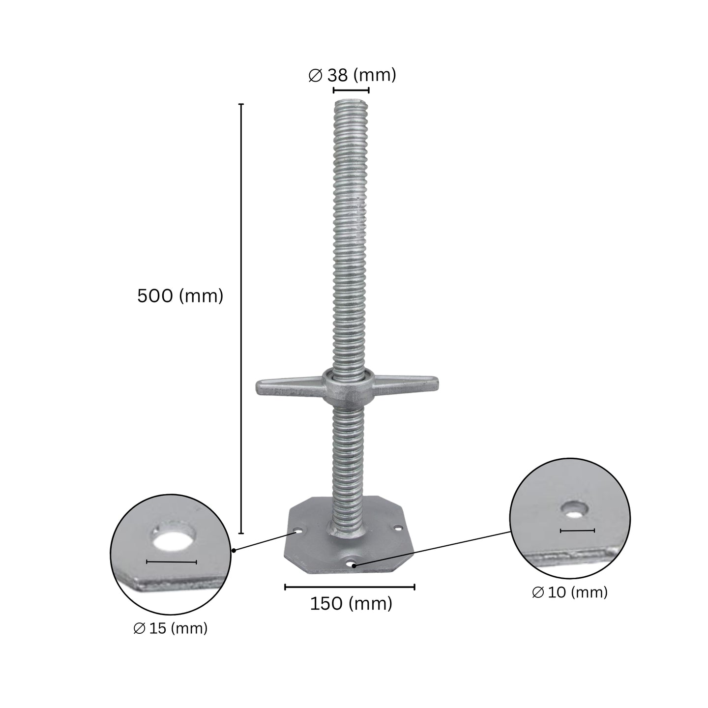 FEATURES - The Scaffold Adjustable Leveling feet have a diameter of 38 mm, making them suitable for all scaffolding with a tube diameter of 4.83 cm. We offer them in various lengths: 300 mm, 500 mm, 600 mm, 650 mm, 800 mm, 950 mm, and 1000 mm.