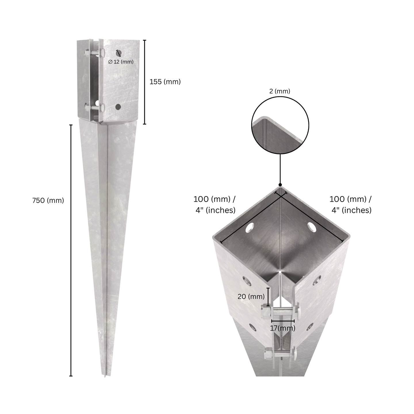 Technical Details - Size: 75 x 75 x 600 mm - Weight: 1.91 kg - Material: Heavy-duty Metal - Finish: Hot Dip Galvanised - Colour: Silver - Pack: 1 x Swift Clamp Drive In Post Support