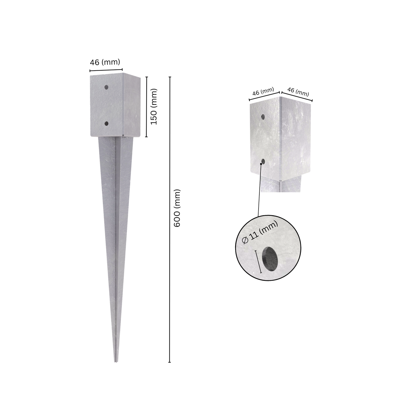 USABILITY - The Fence post spikes are available in lengths of 600 mm, 750 mm, and 900 mm, and in the following Hull sizes: 46 x 46 mm, 51 x 51 mm, 52 x 52 mm, 71 x 71 mm, 81 x 81 mm, 91 x 91 mm, 101 x 101 mm, 121 x 121 mm, and 141 x 141 mm.