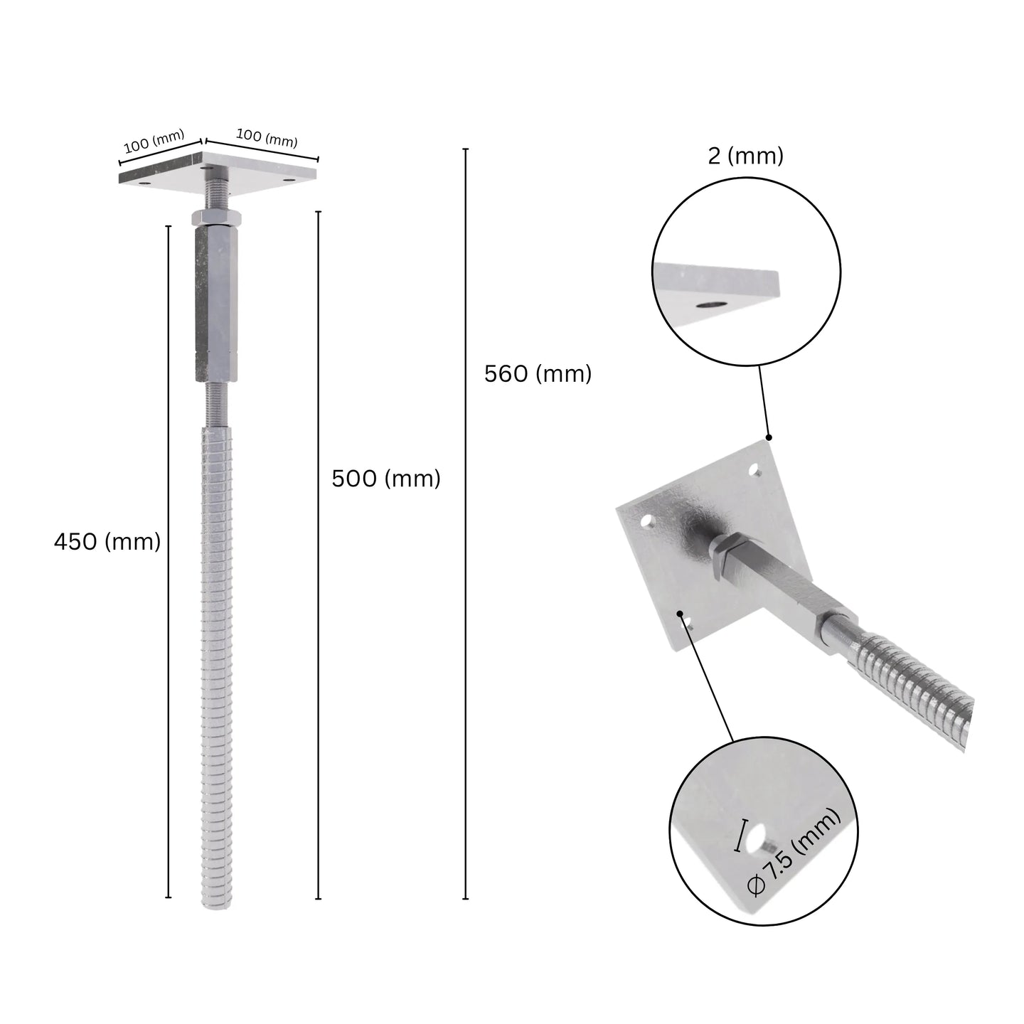 VERSATILITY - For stability, approx. 10 - 20 mm of the adjustment range is required for thread safety, and the galvanisation ensures the Post support is protected from external weather influences.