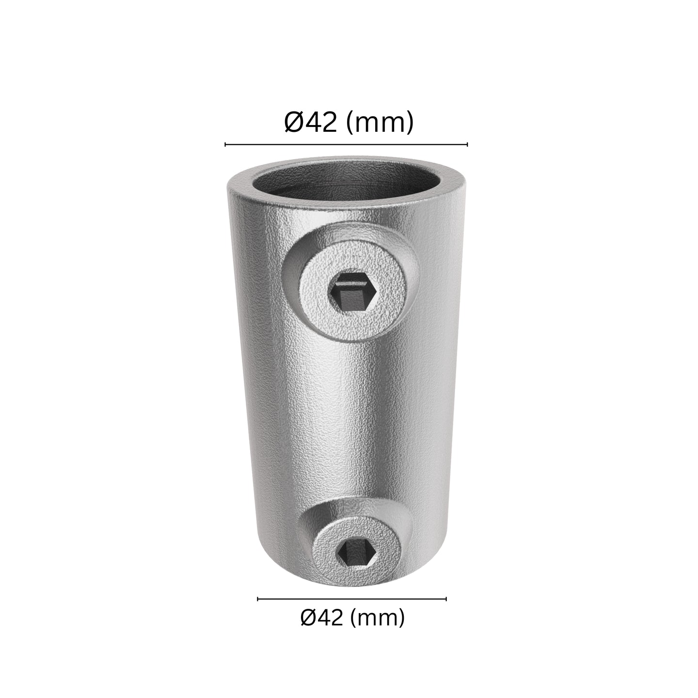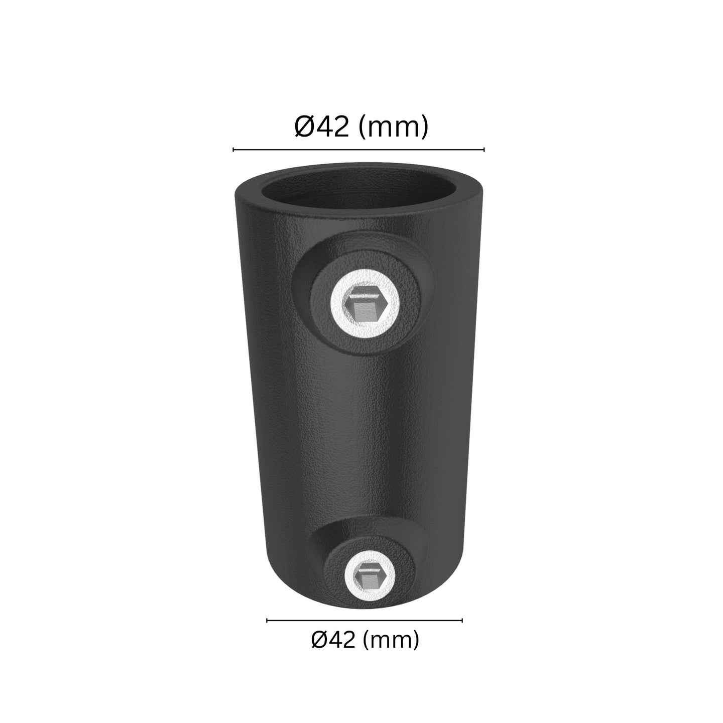 Inline Tube Connector for Strong Joints - Inline external tube connector joins two tubes of the same diameter in a straight line. This 42mm interclamp inline connector features two round sockets and is used to extend tubes in railings and other structural systems that require a continuous connection.