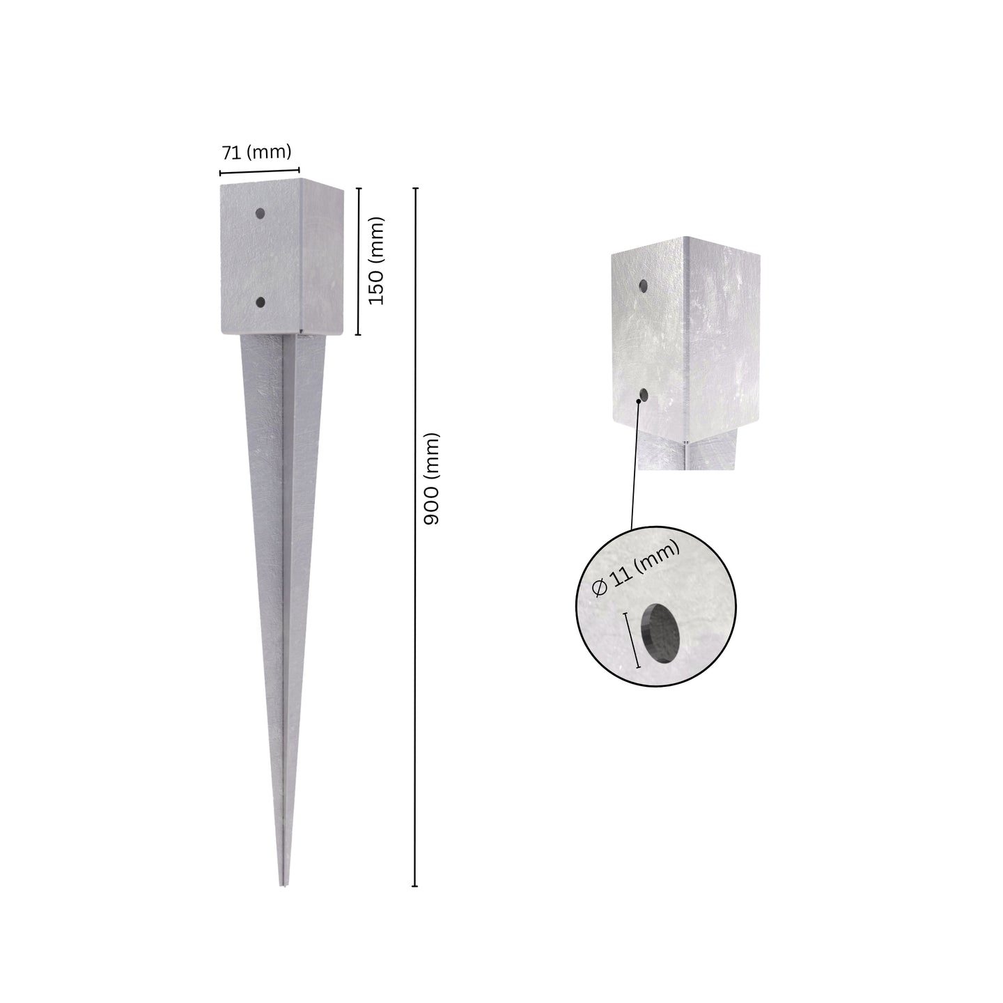 USABILITY - The Fence post spikes are available in lengths of 600 mm, 750 mm, and 900 mm, and in the following Holder sizes: 46 x 46 mm, 51 x 51 mm, 52 x 52 mm, 71 x 71 mm, 81 x 81 mm, 91 x 91 mm, 101 x 101 mm, 121 x 121 mm, and 141 x 141 mm.
